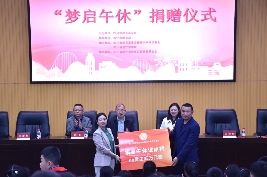 近日,在遂宁中学界福校区,一场以“关爱睡眠质量,护航健康成长”为主题的“梦启午休”教育助学捐赠仪式举行。此次活动由四川省教育基金会主办,遂宁市教育局指导,四川省遂宁中学校、四川省教育基金会壹格未来专项基金承办,四川省遂宁市教育公益慈善基金会协办,助力150套午睡课桌椅在遂宁中学界福校区“安家落户”。