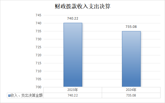 2024年度财政拨款收入、支出总计均为735.08万元。与2023年度相比,财政拨款收入、支出总计各减少5.14万元,下降0.7%。主要变动原因是人员调出,使得对应的经费减少。