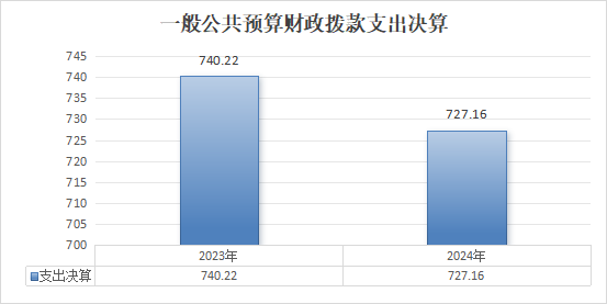 2024年度一般公共预算财政拨款支出727.16万元,占本年支出合计的98.92%。与2023年度相比,一般公共预算财政拨款支出减少13.06万元,下降1.76%%。主要变动原因是人员调出,使得对应的经费减少。