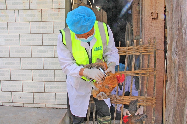 不多时,桂花镇畜牧兽医站站长刘建兵与防疫人员来到田中金家里,准备为畜禽进行免疫注射。