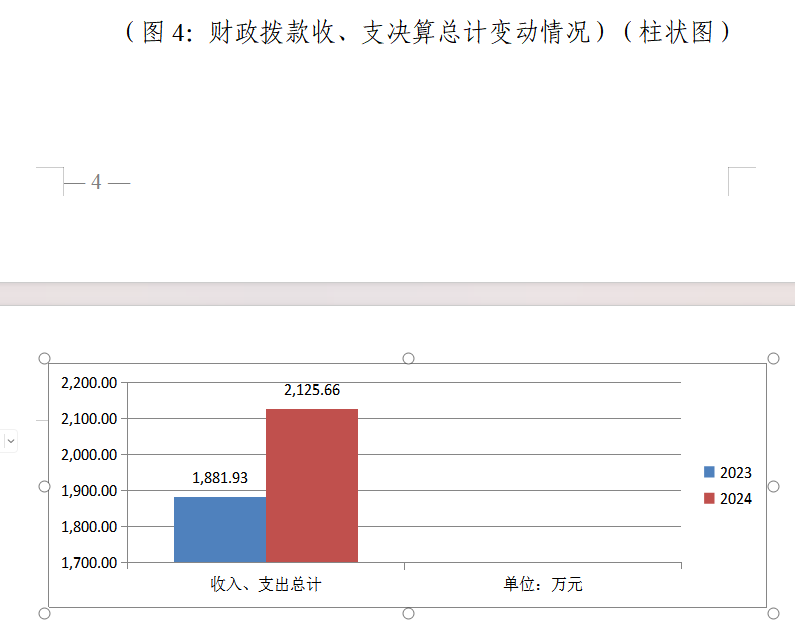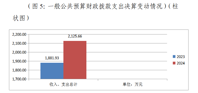 2024年度财政拨款收入、支出总计均为2125.66万元。与2023年度相比,财政拨款收入总计、支出总计各增加243.73万元,增长12.95%。主要变动原因是本年度宣传及媒体融合资金及新增省级宣传文化事业发展专项资金项目资金的增加。