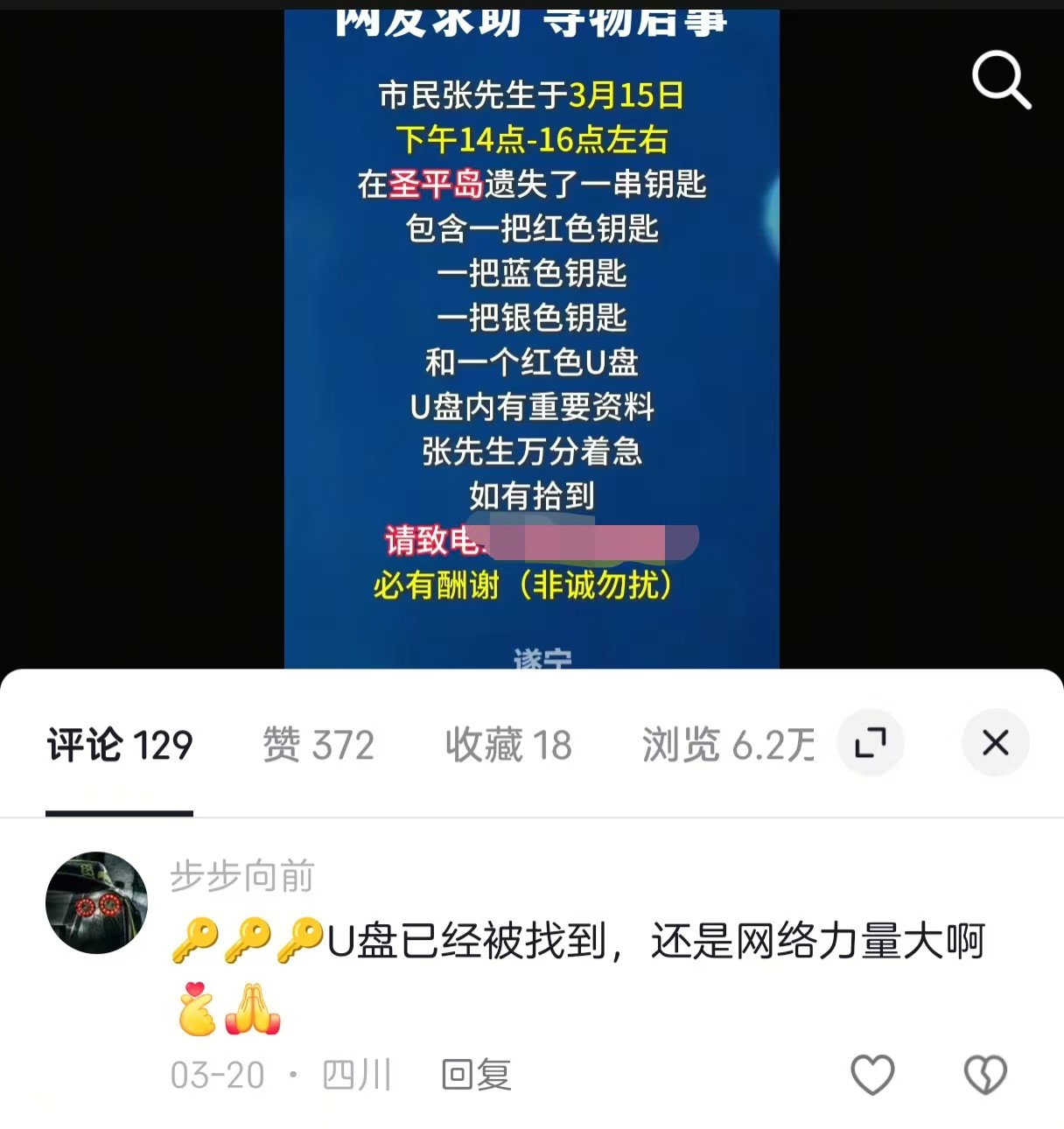 3月中旬,遂宁市民张先生不慎遗失一串重要的钥匙串,上面包含工作U盘一个,多方寻找未果后,他抱着试一试的心态通过抖音联系到遂宁新闻网官方账号。接到求助后,遂宁新闻网迅速响应,根据张先生提供的线索,制作了包含钥匙特征、遗失时间地点等信息的短视频,并添加#寻物启事等热门话题标签发布,呼吁网友接力转发,形成线上线下联动的寻物网络。视频发布后,迅速引发本地网友关注,并在5天内通过评论区反馈线索,帮助张先生寻回物品,解了他的燃眉之急。
