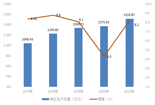 根据地区生产总值统一核算初步结果,2021年遂宁市实现地区生产总值(GDP)1519.87亿元,按可比价格计算,比上年增长8.2%。其中,第一产业增加值220.81亿元,增长7.6%;第二产业增加值704.07亿元,增长7.7%;第三产业增加值594.99亿元,增长8.9%。