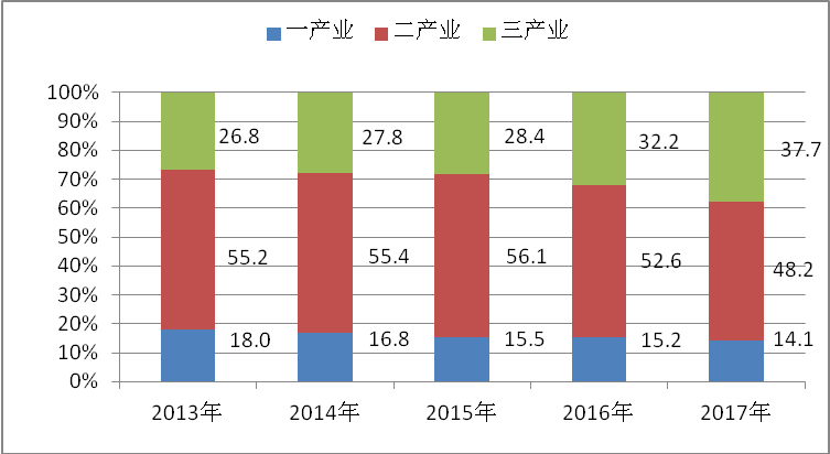 图2 2013-2017年三次产业增加值占地区生产总值的比重