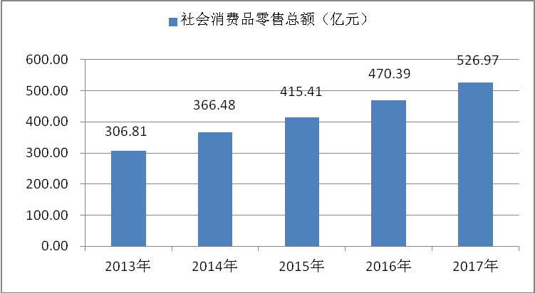 全年实现社会消费品零售总额526.97亿元,增长12.0%。按经营地分,城镇实现零售额390.44亿元,增长11.9%;乡村实现零售额136.53亿元,增长12.5%。按行业分,批发业实现零售额53.85亿元,增长12.1%;零售业实现零售额403.35亿元,增长12.0%;住宿业实现零售额7.42亿元,增长12.2%;餐饮业实现零售额62.34亿元,增长12.0%。