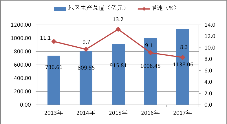 全年实现地区生产总值(GDP)1138.06亿元,按可比价格计算比上年(下同)增长8.3%。其中,第一产业增加值160.41亿元,增长3.6%,对经济增长的贡献率为6.3%,拉动经济增长0.5个百分点;第二产业增加值548.6亿元,增长8.6%,对经济增长的贡献率为52.1%,拉动经济增长4.3个百分点;第三产业增加值429.05亿元,增长10.0%,对经济增长的贡献率为41.6%,拉动经济增长3.5个百分点。三次产业结构由上年的15.2:52.6:32.2调整为今年的14.1:48.2:37.7。人均地区生产总值34835元,增长9.2%。