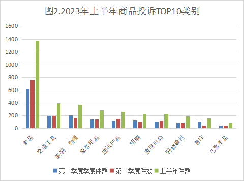 (一)食品安全投诉增幅较大。第一季度食品安全相关投诉391件,第二季度食品安全相关投诉608件,环比上升60%,增长最快。主要问题在于食品过期、变质发霉、有异物异味、食用后呕吐腹泻、食物中毒等。主要原因一是天气变热、食物变质;二是经营者未定期处理过期产品、使用变质食品违规生产;三是消费者食品安全科普知识不足,自我保护能力弱;四是购买食品时检查辨别意识差等。
