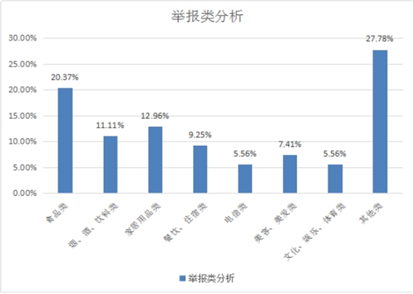 上半年,共受理举报54件,办结54件,办结率100%。其中,商品类举报30件,占举报总量的55.56%;服务类举报24件,占举报总量的44.44%。 其中食品类举报11件,占举报总数的20.37 %;烟、酒、饮料类举报6件,占举报总数的 11.11%;家居用品类举报7件,占举报总数的12.96 %;餐饮、住宿类举报5件,占举报总数的 9.25%;电信类举报3件,占举报总数的5.56%,美容、美发类举报4件,占举报总数的7.41%,文化、娱乐、体育类举报3件,占举报总数的5.56%,其他类举报15件,占举报总数的27.78%。