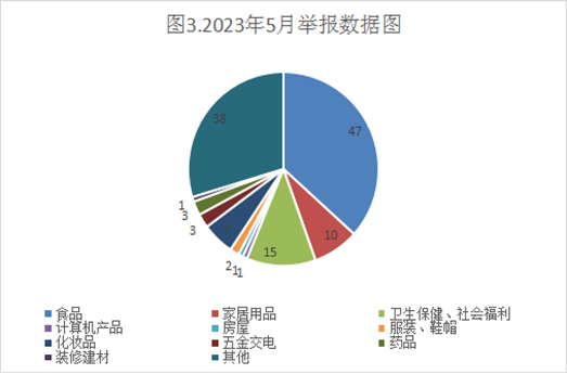 从举报问题来看,举报量较大的主要有:食品类(47件)、家居用品类(10件)、卫生保健、社会福利类(15件),合计占比56.25%。