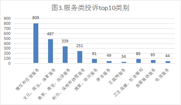 (三)服务投诉类型。服务类投诉量共2939件,占投诉总量的33.12%。其中餐饮和住宿服务809件,占比27.53%;文化、娱乐、体育服务487件,占比16.57%;制作、保养和修理服务251件,占比8.54%;美容、美发、洗浴服务339件,占比11.53%;教育、培训服务91件,占比3.1%;电信服务44件,占比1.5%;房屋装修服务65件,占比2.21%;停车服务49件,占比1.67%;互联网服务34件,占比1.16%;卫生保健、社会福利服务86件,占比2.93%;租赁服务17件,占比0.58%;其他服务667件,占比22.69%。从数据上看,投诉量较大的服务主要有:餐饮和住宿服务(809件)、文化、娱乐、体育服务(487件)、制作、保养和修理服务(251件)、美容、美发、洗浴服务(339件),合计占比64.17%。