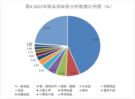2022年,市市场监管局共接收举报1263件,占接收总量的9.38%。商品类举报874件,其中,一般食品类举报383件,占商品类举报总数的43.82%;烟、酒和饮料类60件,占商品类举报总数的6.86%;保健食品类13件,占商品类举报总数的1.49%;服装、鞋帽类46件,占商品类举报总数的5.26%;家居用品类31件,占商品类举报总数的3.55%;家用电器类17件,占商品类举报总数的1.95%;通讯产品类14件,占商品类举报总数的1.6%;交通工具类21件,占商品类举报总数的2.4%;化妆品类39件,占商品类举报总数的4.46%;药品类26件,占商品类举报总数的2.97%;首饰类15件,占商品类举报总数的1.72%;计算机产品类3件,占商品类举报总数的0.34%;其他206件,占商品类举报总数的23.57%。服务类举报389件,其中,美容、美发、洗浴服务类最多,达142件,占服务类举报总数的36.5%,其次是餐饮和住宿服务类62件,占服务类举报总数的16.94%,合计52.44%。