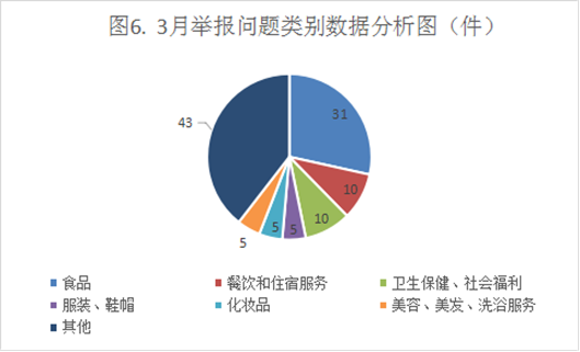 3月,市市场监督管理局共接收举报109件,环比上升29.76%。其中,举报量较大的问题食品(31件)、餐饮和住宿服务(10件)、卫生保健、社会福利(10件),合计占比47%。