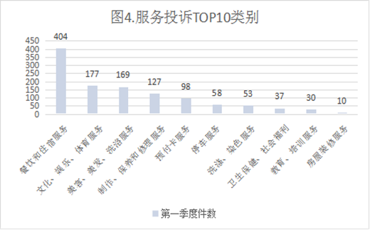 (三)服务投诉类型。服务类投诉量共1375件,占投诉总量的38.52%。其中餐饮和住宿服务404件,占比29.38%;文化、娱乐、体育服务177件,占比12.87%;美容、美发、洗浴服务169件,占比12.29%;制作、保养和修理服务127件,占比9.24%;预付卡服务98件,占比7.13%;停车服务58件,占比4.22%;洗涤、染色服务53件,占比3.85%;卫生保健、社会福利服务37件,占比2.69%;教育、培训服务30件,占比2.18%;房屋装修服务10件,占比0.73%;其他服务212件,占比15.42%。从数据上看,投诉量较大的服务主要有:餐饮和住宿服务(404件)、文化、娱乐、体育服务(177件)、制作、保养和修理服务(127件)、美容、美发、洗浴服务(169件),合计占比63.78%。
