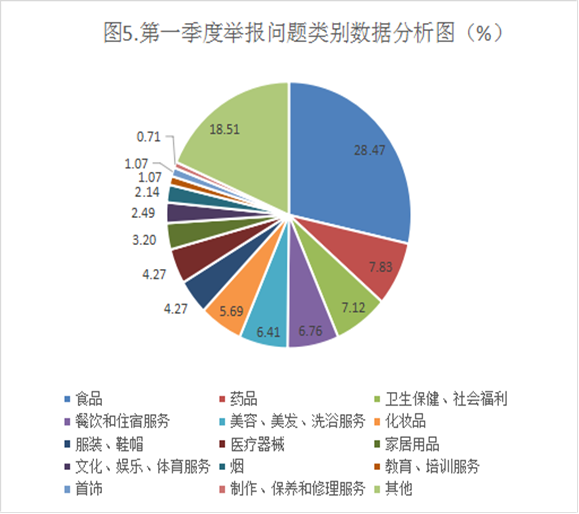从举报问题来看,举报量较大的主要有:食品(80件)、药品(22件)、卫生保健、社会福利(20件)、餐饮和住宿服务(19件),合计占比50.18%。