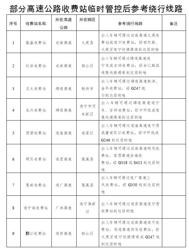实行临时管控期间,上述收费站禁止车辆上、下高速公路(执行应急任务的警车、消防车、救护车、工程抢险车、应急医疗物资运输车、基本生活保障供给车和指挥工作用车除外),各车辆可根据出行安排选择其他收费站通行(参考绕行路线详见附件)。