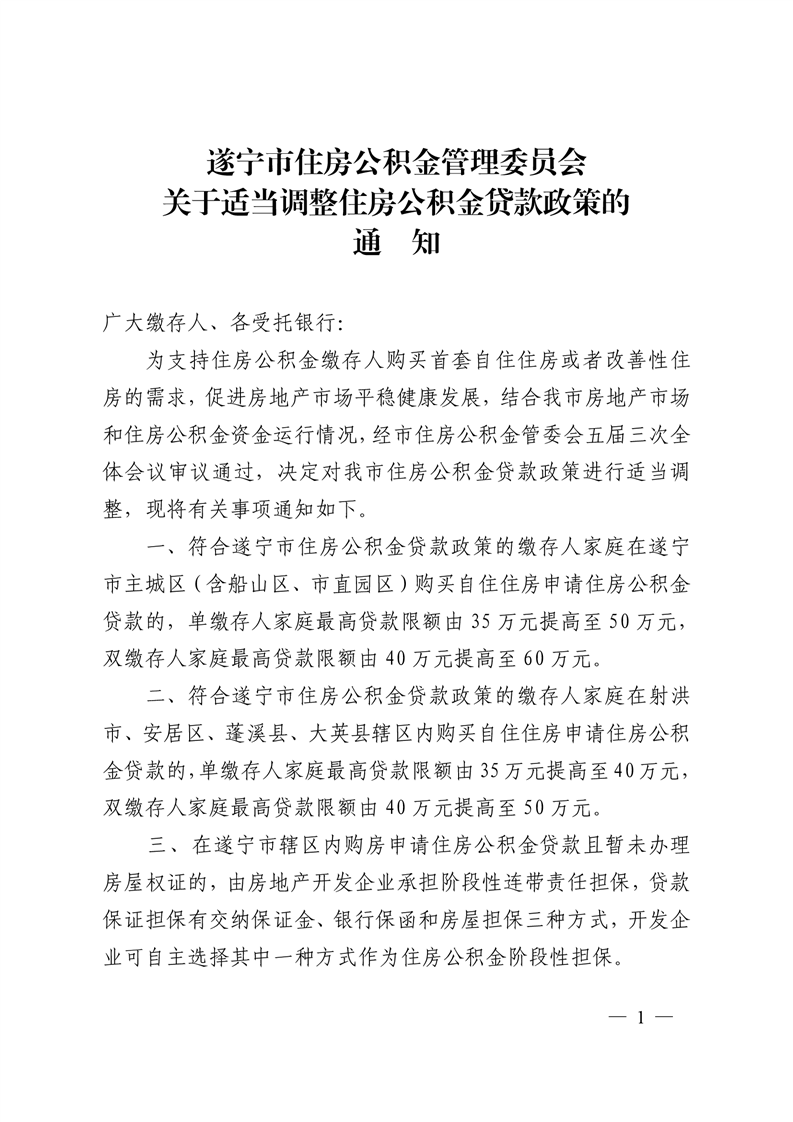 遂宁市住房公积金管理委员会关于适当调整住房公积金贷款政策的通知