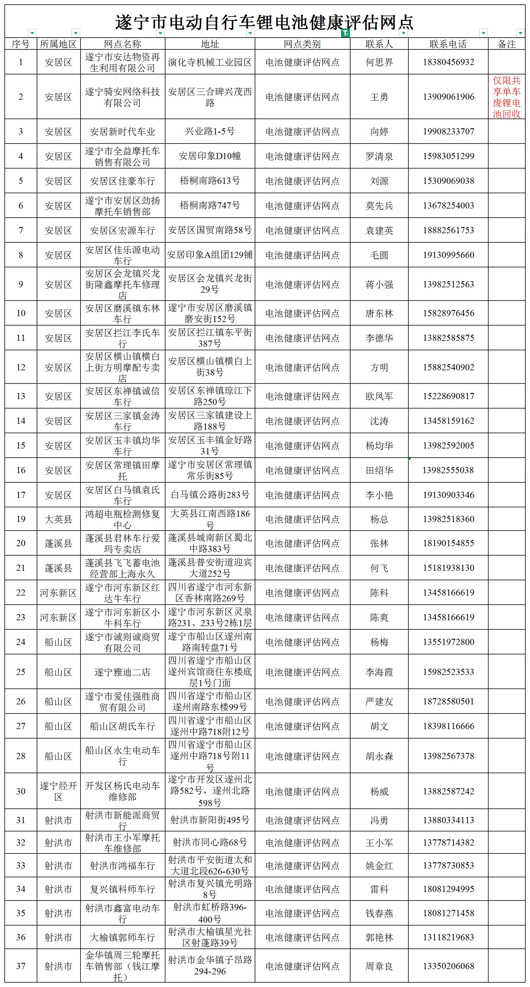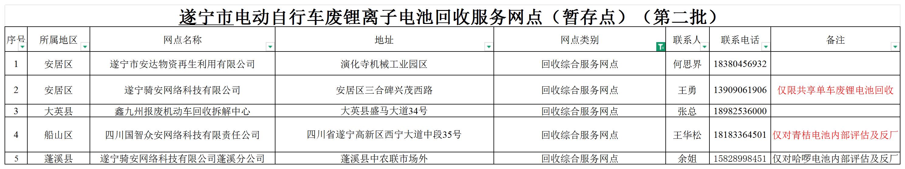 关于公布遂宁市电动自行车废锂离子电池回收服务网点(暂存点)和健康评估网点名单的通告