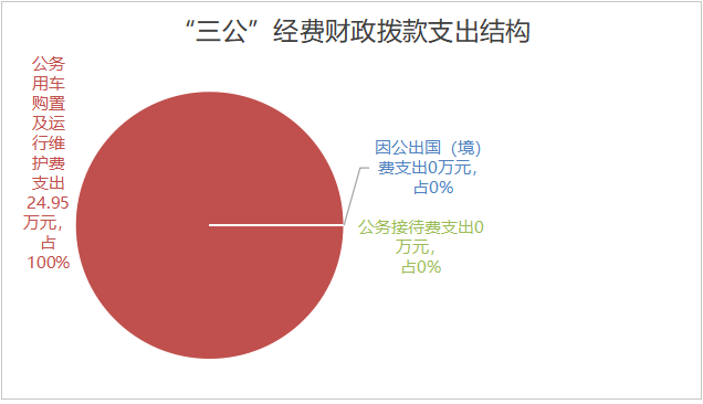 2023年“三公”经费财政拨款支出决算中,因公出国(境)费支出决算0万元,占0%;公务用车购置及运行维护费支出决算24.95万元,占100%;公务接待费支出决算0万元,占0%。具体情况如下:
