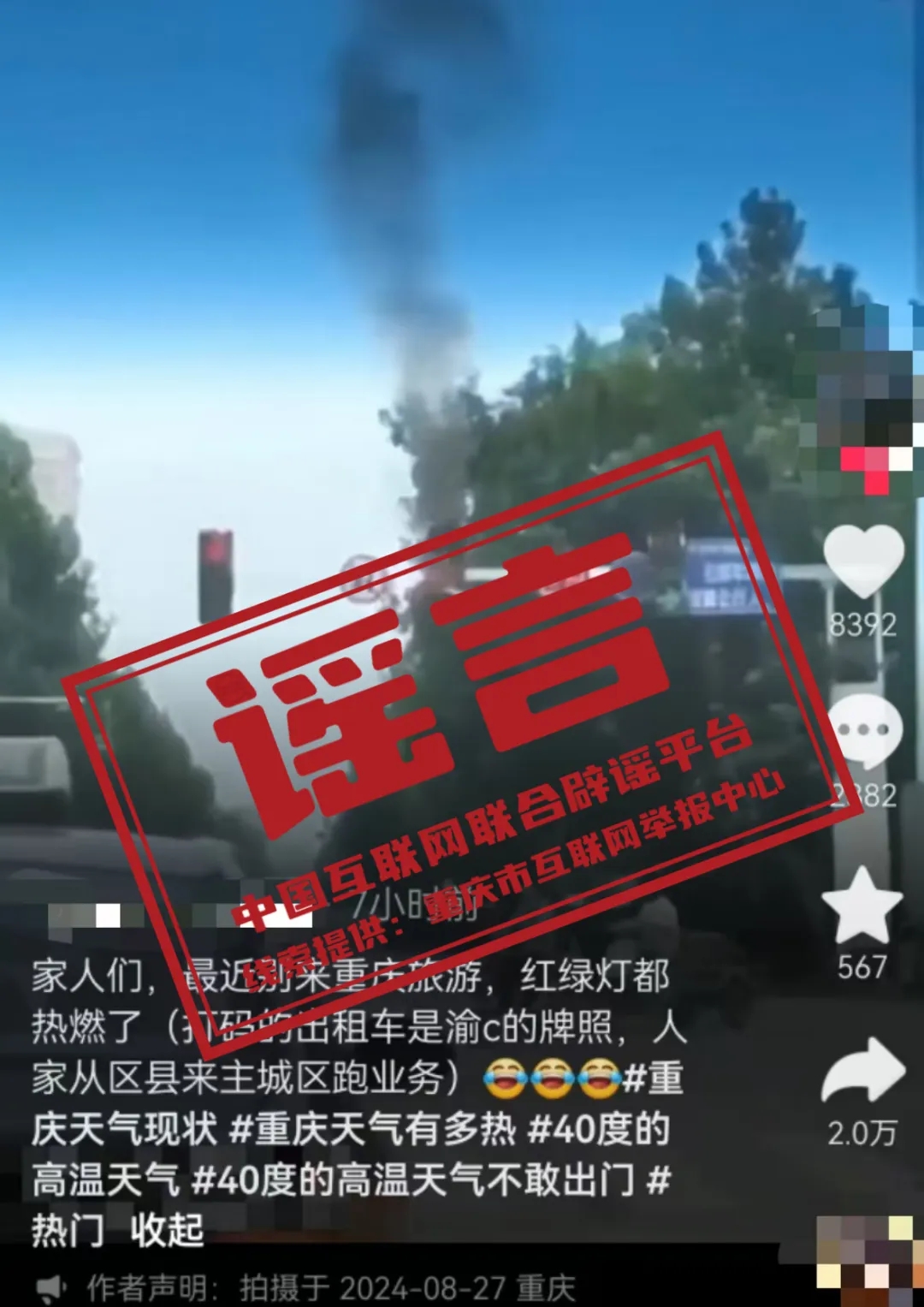 今日辟谣(2024年8月29日) 谣 言 重庆红绿灯热燃了?