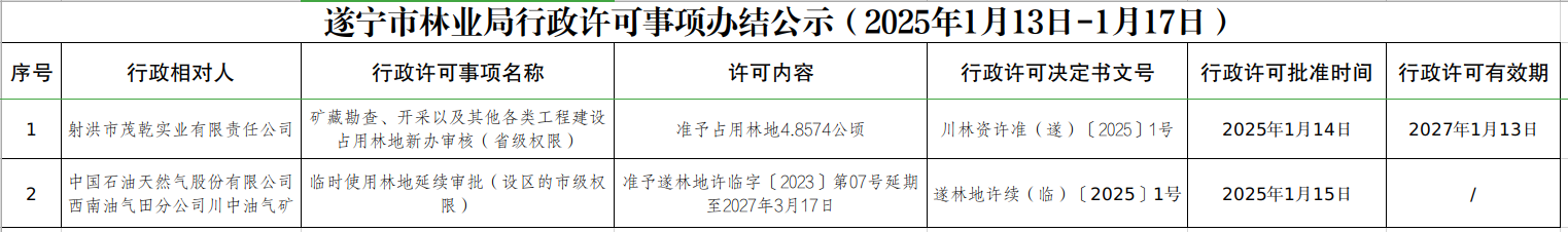 遂宁市林业局行政许可事项办结公示(2025年1月13日-1月17日)