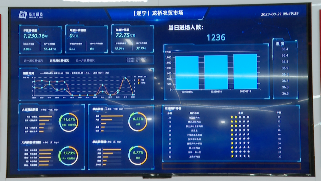 “没想到家门口也能逛上智慧农贸市场,不仅环境好,还能在市场内的智慧平台上看到菜品的质量、价格,方便又放心。”在遂宁经开区明月路惠民巷龙桥农贸市场内,市民王凤正在选购菜品。市场内,蔬菜区对面的墙壁上有一块蓝色的显示屏,实时显示着当天商品价格、客流人数、交易数量、商品检测次数和合格率等。市场外,LED大屏上公示着菜价和食品检测后的数据。