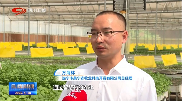 遂宁市美宁农牧业科技开发有限公司总经理万海林:通过智慧化的农业能够有效地控制(大棚内)温度,蔬菜种植保证了它的一个产量,另外我们通过控温控湿、精准营养,进一步提高产品的品质和口感。