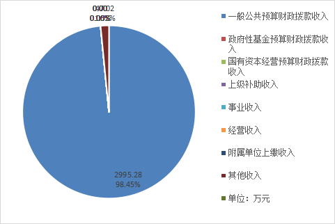 2023年度本年收入合计3042.3万元,其中:一般公共预算财政拨款收入2995.28万元,占98.45%;政府性基金预算财政拨款收入0万元,占0%;国有资本经营预算财政拨款收入0万元,占0%;上级补助收入0万元,占0%;事业收入0万元,占0%;经营收入0万元,占0%;附属单位上缴收入0万元,占0%;其他收入47.02万元,占1.55%