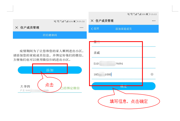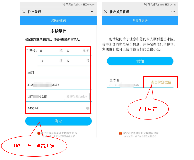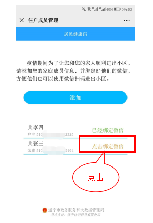 住户在微信公众号中,搜索"遂宁政务服务",在公众号菜单健康码中点击"住户登记",进入家庭成员管理页面,点击"添加"按钮,在添加页面,输入家庭成员信息并保存,保存后回到家庭成员管理页面,"点击绑定微信"直至家庭成员显示微信绑定成功,如图所示:
