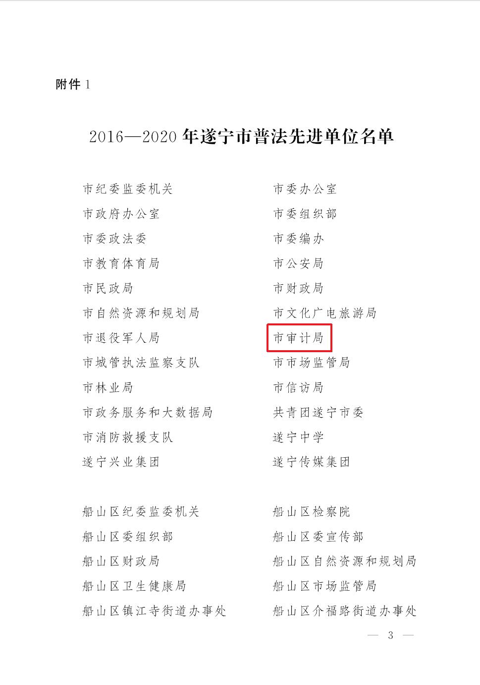 近日,中共遂宁市委办公室印发《中共遂宁市委 遂宁市人民政府关于表扬2016—2020年遂宁市普法先进单位和先进个人的通报》,遂宁市审计局荣获2016—2020年遂宁市普法先进单位。