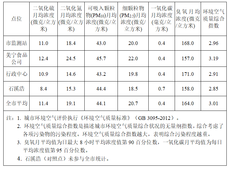 本月遂宁市城区环境空气质量2天优、25天良、4天轻度污染,空气质量达标率为87.1%,主要污染物SO2、NO2、PM10、PM2.5、CO和O3的月均值分别为11.4微克/立方米、19.1微克/立方米、44.1微克/立方米、20.7微克/立方米、0.4毫克/立方米和164.0微克/立方米。同比SO2、NO2、PM10、PM2.5、O3 浓度分别上升75.4%、15.8%、48.0%、61.7%、16.3%,CO浓度同比持平;环比SO2、NO2、PM10、PM2.5、O3 浓度分别上升18.8%、69.0%、47.5%、72.5%、29.1%,CO浓度同比持平。各测点主要污染物浓度详见表1。