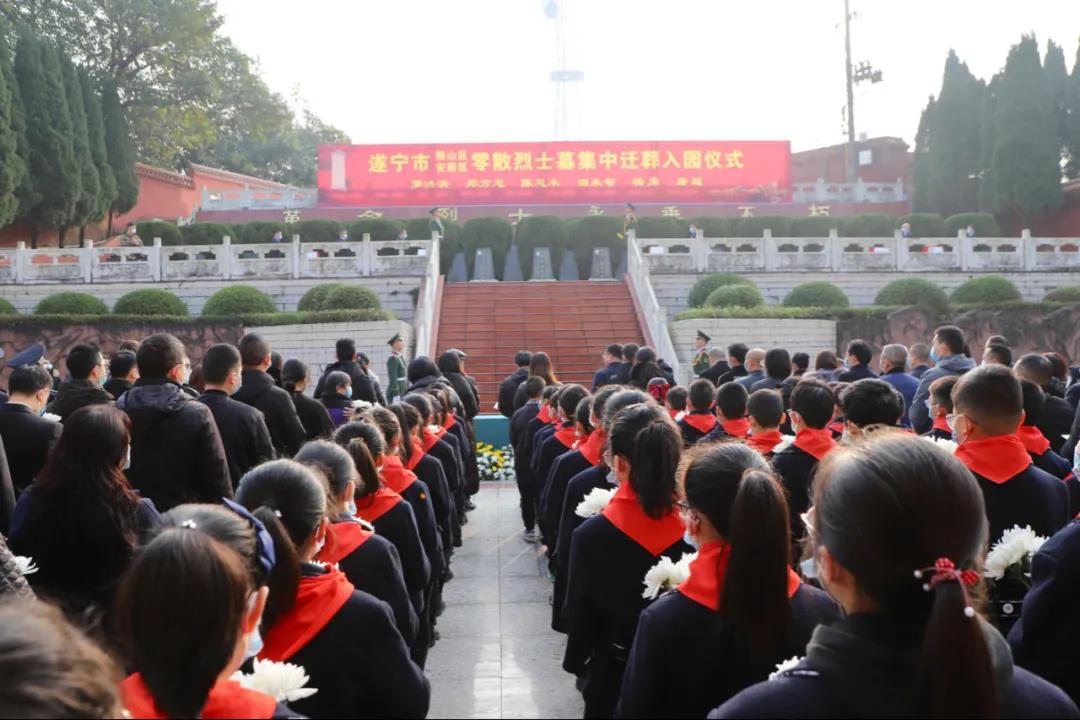 青山苍苍埋忠骨,白云悠悠抚英魂。2021年12月22日,遂宁市船山区、安居区零散烈士墓集中迁葬入园仪式在遂宁烈士陵园举行。遂宁市退役军人事务局党组书记、局长唐思伦,船山区人大常委会副主任舒峰、安居区政协副主席周胜勇出席仪式。遂宁市退役军人事务局党组成员、副局长李刚主持仪式。干部职工代表、学生代表、烈士亲属等社会各界群众参加仪式。