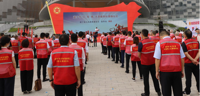 为深入贯彻落实习近平总书记关于志愿服务重要指示、党中央关于新时代文明实践志愿服务工作有关要求和全国退役军人志愿服务工作部署会精神,推动全市退役军人及退役军人工作者志愿服务健康发展,6月10日上午,遂宁市“红·军·情”志愿服务队授旗仪式在市民中心隆重举行。