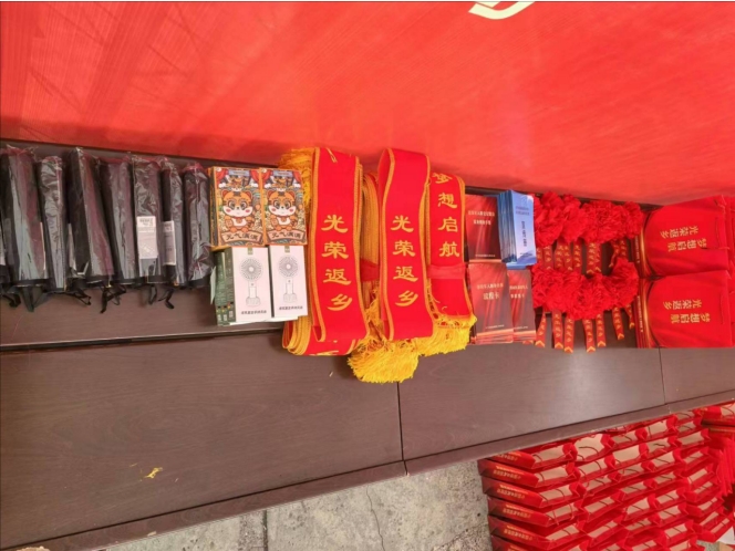 返乡接待站配备绶带红花、“两卡两手册”及矿泉水、藿香正气液、小风扇等物资为退役军人返乡途中提供暖心服务。
