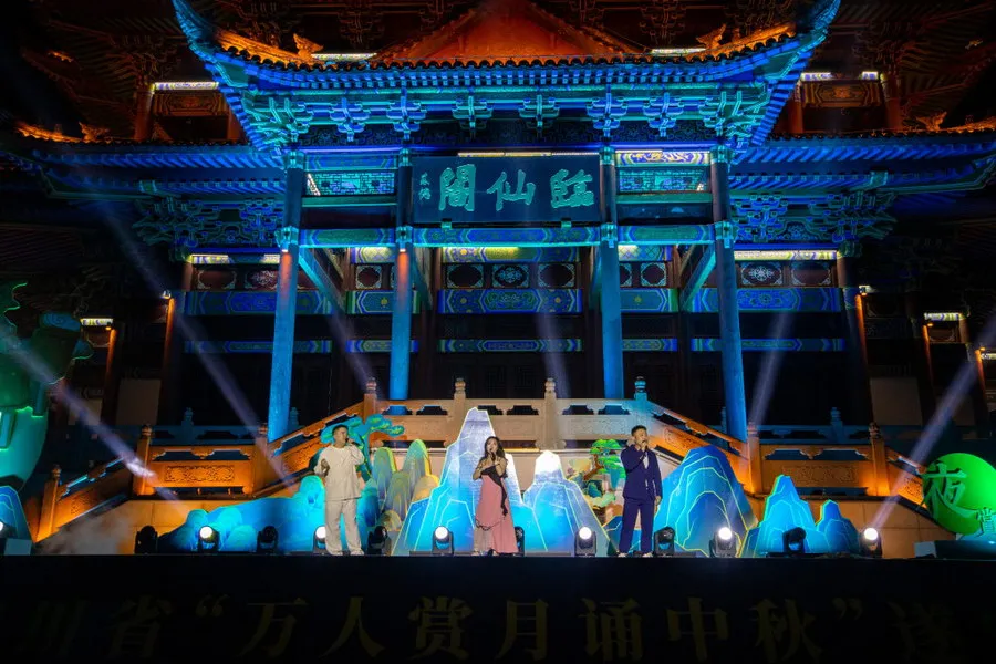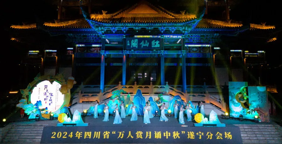 活动在一曲《大唐荣耀》霓裳舞中拉开序幕,节奏婉转轻快,演员们舞姿婀娜。最是相思许明月,不管是“每逢佳节倍思亲”的想念,还是“但愿人长久,千里共婵娟”的祝福,朗诵节目《中秋夜·遂州月》诉说着无数游子的殷殷之情,诗意总能最准确深情地描绘出华夏儿女心间那说不清、道不明的情愫。过中秋,自然少不了千年传统文化“沉淀”出的文艺,四川盘子《水都消息》、川剧《嫦娥奔月》等节目唱出千年遂州的文化自信,在演员举手投足的舞姿、清脆明亮的唱腔中,展现着遂宁的绵长文脉。