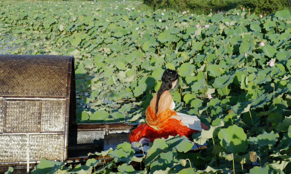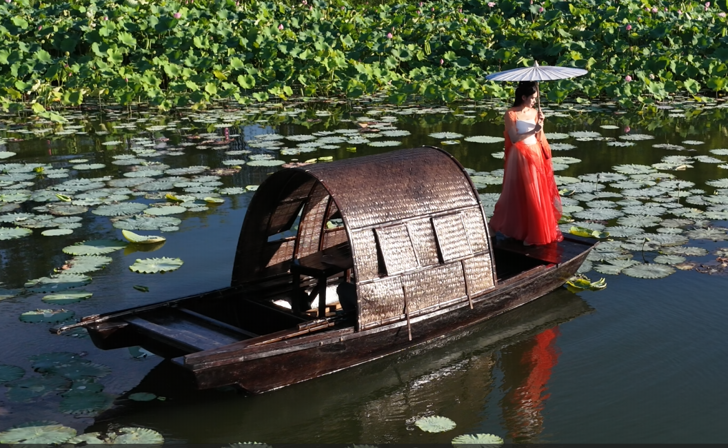 轻轻摇橹,扁舟缓缓滑入荷塘深处