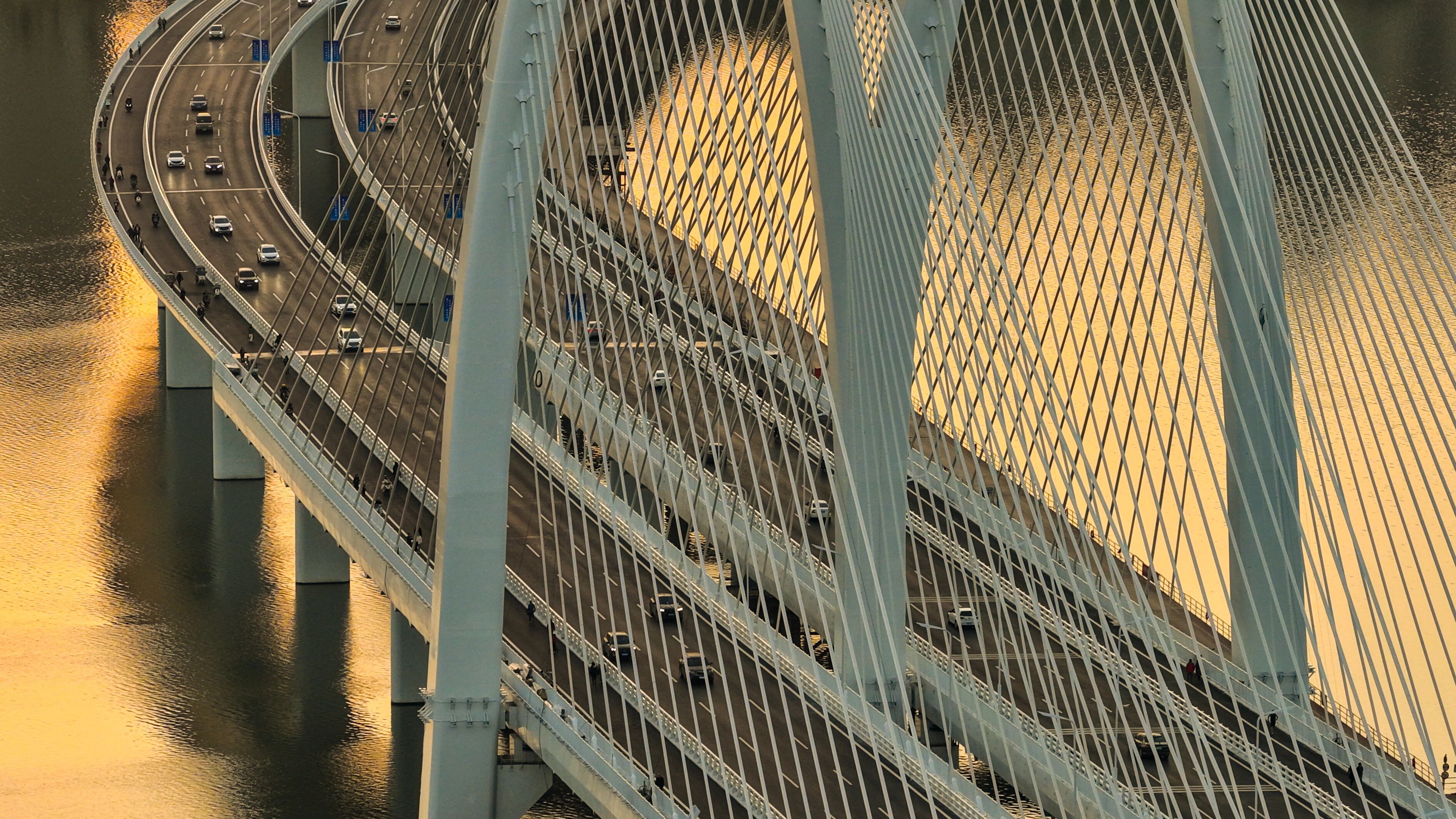 当夕阳为白色桥塔披上金纱