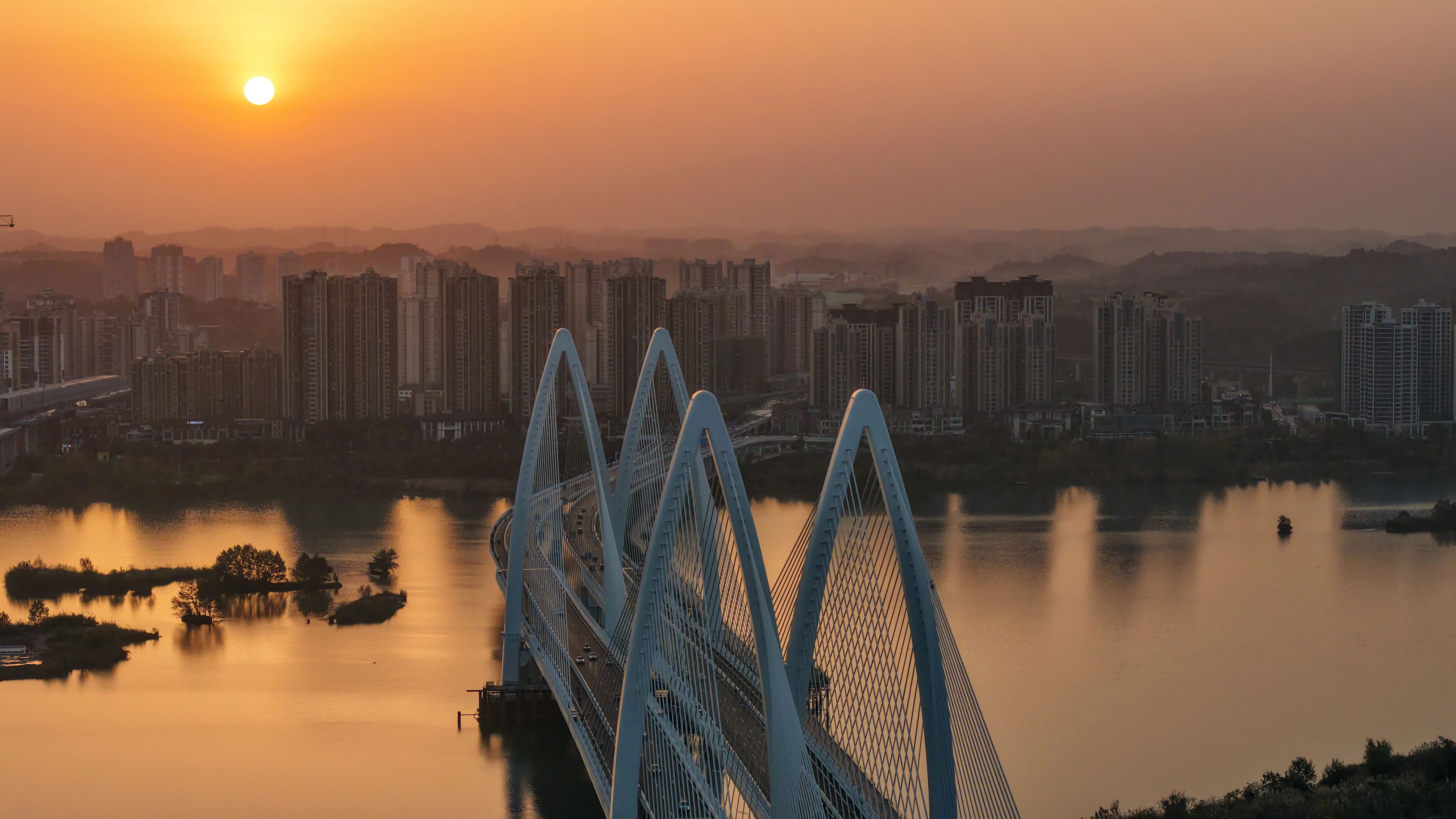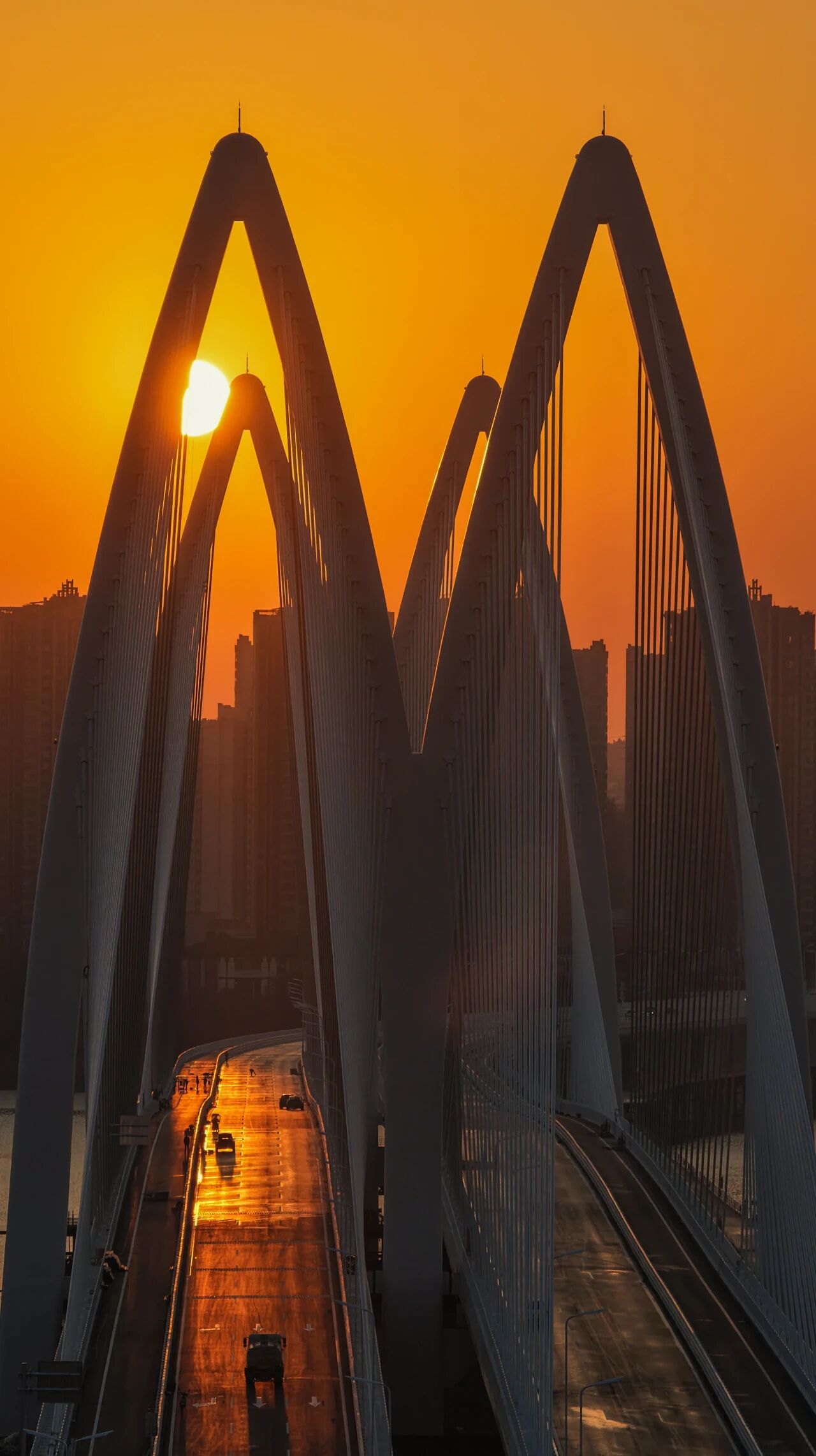 落日熔金,桥塔如琴弦