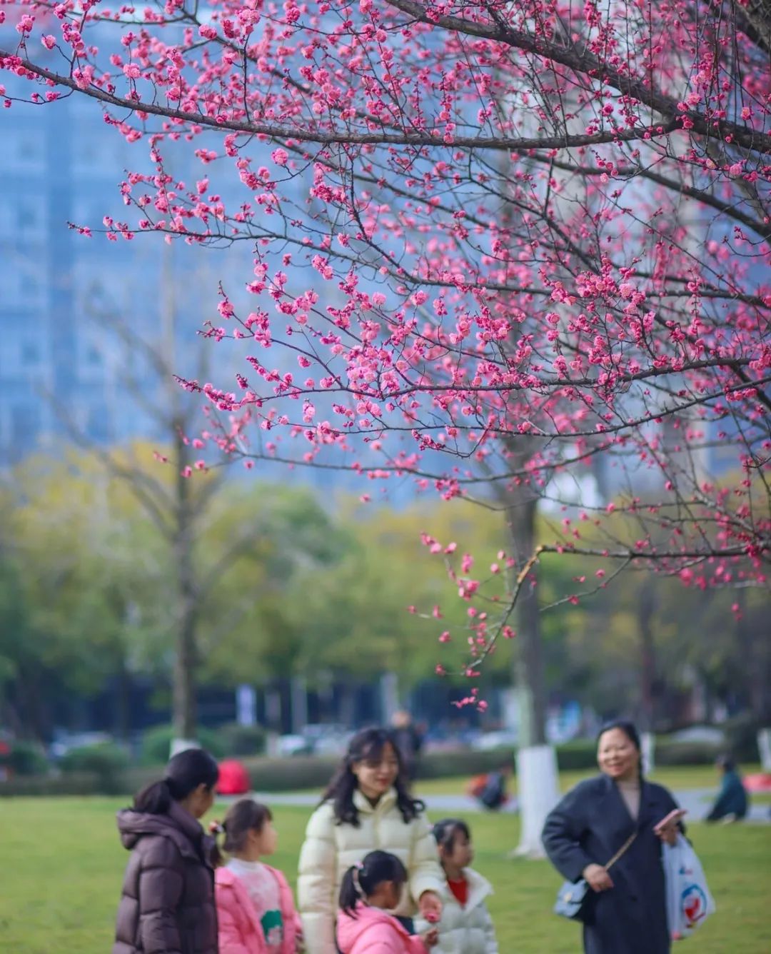梅影绰绰,与周围建筑、江景等相映成趣,构成道道别样风景。市民游客驻足花下,赏梅观景打卡,领略早春的浪漫气息,怡然自乐。