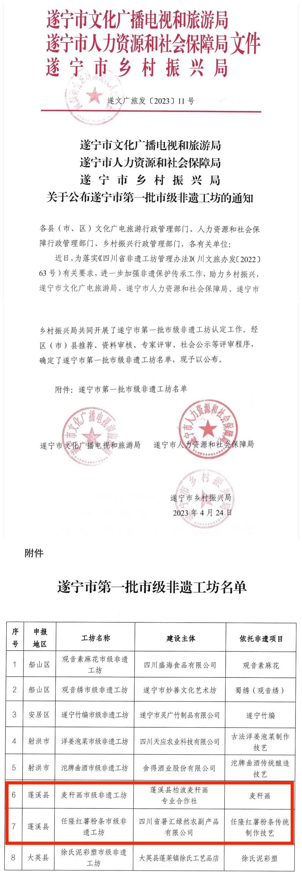 4月24日遂宁市文化广播电视和旅游局发布了《关于公布遂宁市第一批市级非遗工坊的通知》(遂文广旅发[2023]11号),其中,蓬溪县麦秆画市级非遗工坊、蓬溪县任隆红薯粉条非遗工坊成功入选!