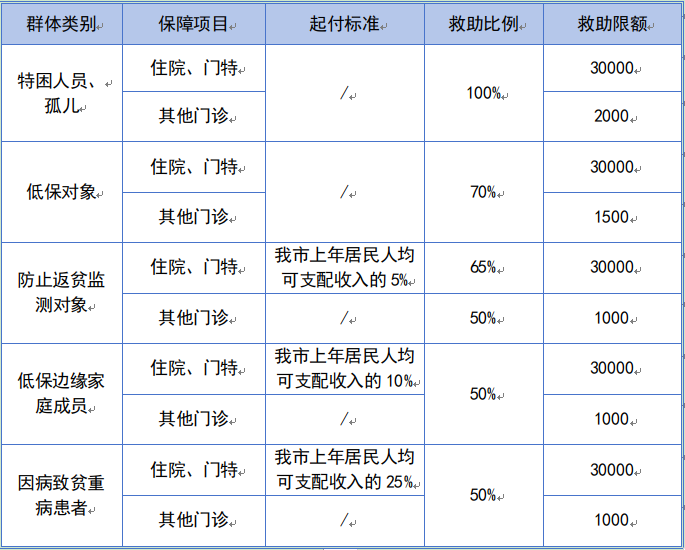 对救助对象一个自然年度内经基本医保、大病保险支付后政策范围内个人自付医疗费用,按群体类别实施分类救助,具体如下: