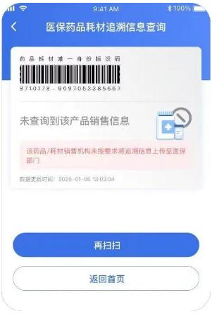 界面如提示“未查询到该产品销售信息”,则说明该药品销售机构未按要求将追溯信息上传至医保信息平台,患者可以要求该药品销售机构出示药品来源单据,以确保药品安全和来源渠道合法。