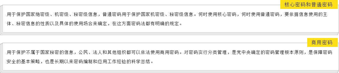为了对密码实施科学管理,确保密码安全保密,充分发挥密码在保护网络与信息安全中的核心支撑作用,密码法按照保护信息的不同,将密码分为三类,分别是核心密码、普通密码和商用密码。