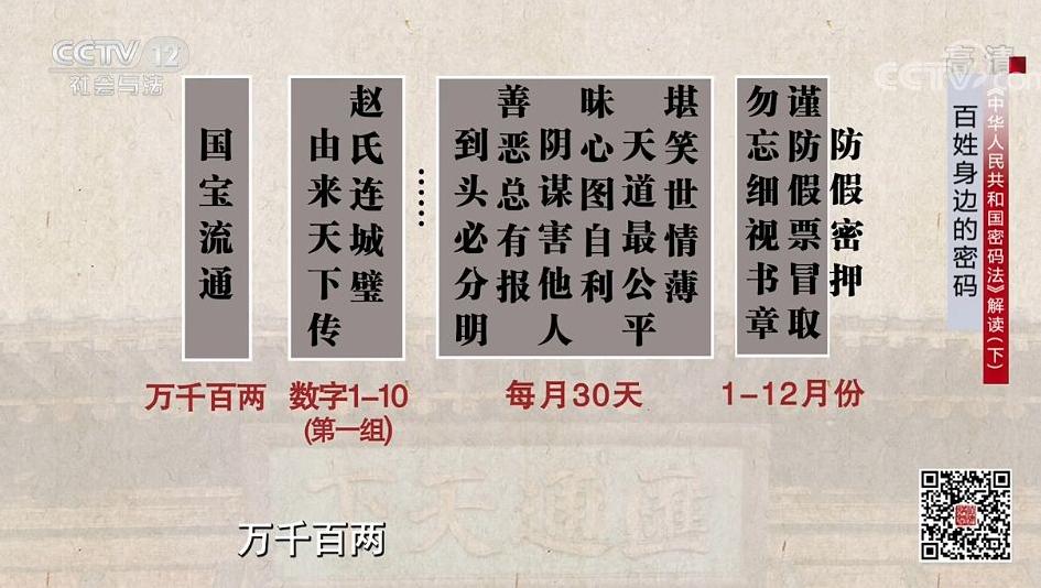 刚才为您讲述了核心密码和普通密码,而密码除了用于保护国家秘密,也与我们老百姓的生活息息相关。那么,密码在我们的日常生活中都有哪些应用?密码法又是怎么规定的呢?我们将在明天的节目中继续为您讲述。