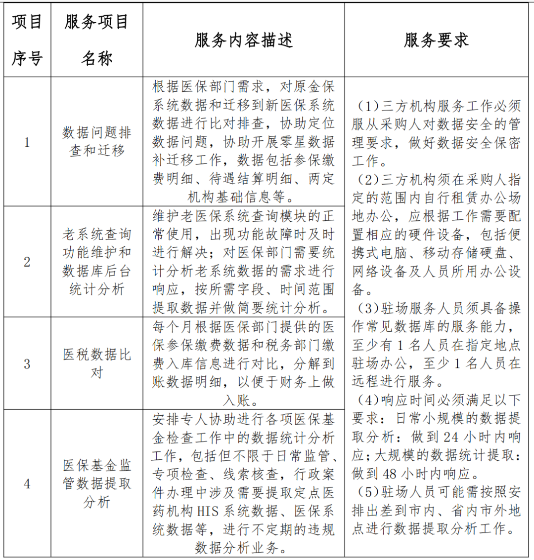 根据工作需要,我单位拟公开比选1家第三方专业服务机构提供“金保工程”系统数据库维护和数据统计分析驻场服务,请有报名意向且符合条件的专业服务机构按要求递交相关资料。