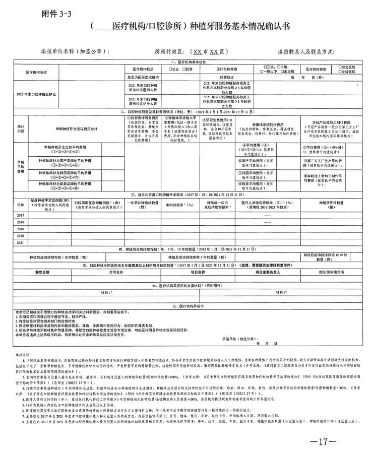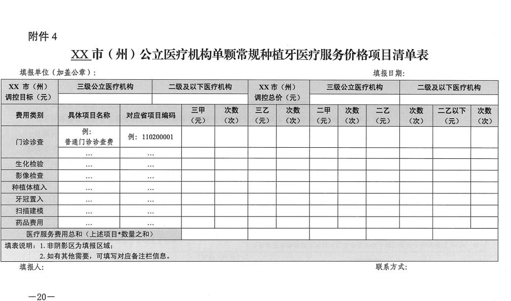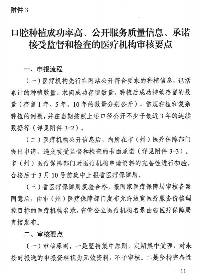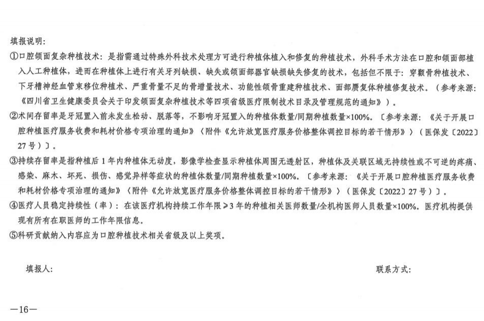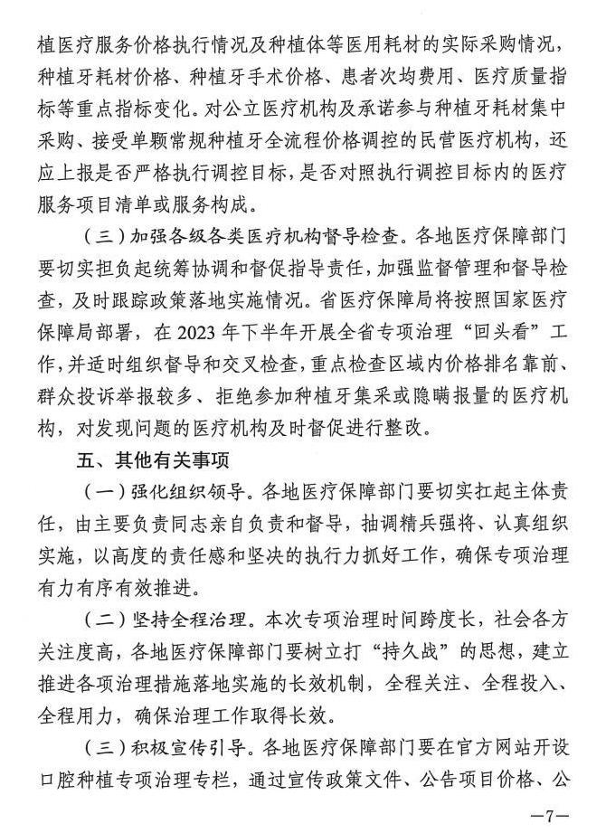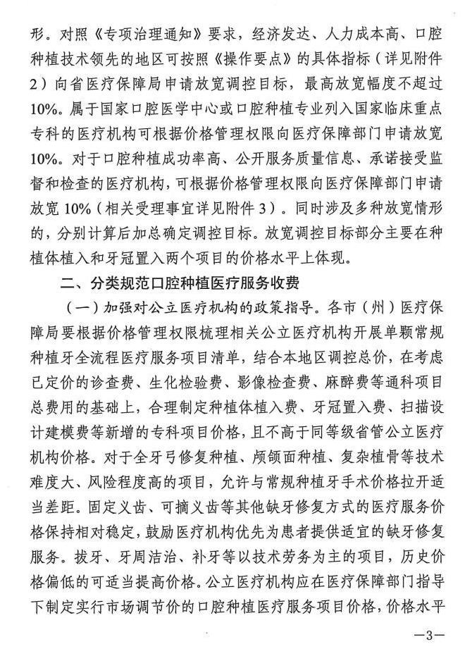 全市已开展口腔种植医疗服务的医疗机构要对照省医保局文件要求进行梳理,确定是否符合放宽价格的条件,符合放宽价格条件的医疗机构请于2023年2月28日17:30前将相关资料报送至市医保局医药服务管理科。全市已开展口腔种植医疗服务的公立医疗机构要同步梳理开展单颗常规种植牙全流程医疗服务项目清单和测算拟开展的市场调节价管理口腔种植医疗服务价格项目成本,全流程服务清单及项目成本测算表请于2023年2月28日17:30前报送至市医保局医药服务管理科(联系人:邹劲,联系电话:0825─2257612)。对于承诺参与种植牙耗材集中带量采购、接受单颗常规种植牙全流程价格调控的民营医疗机构,调控价格按照公立医院确定。