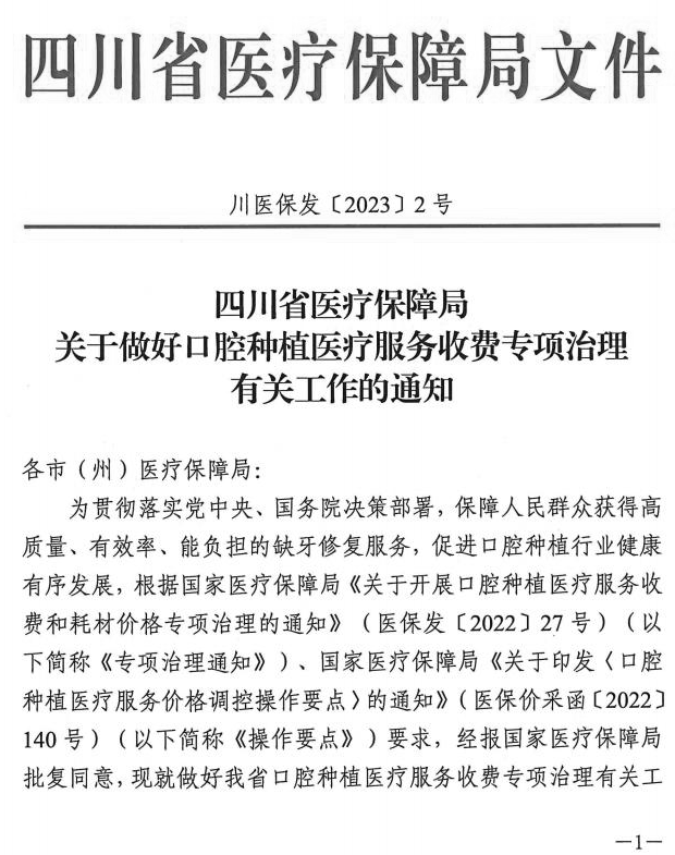 现将《四川省医疗保障局关于做好口腔种植医疗服务收费专项治理有关工作的通知》(川医保发〔2023〕2号)转发给你们,并提出以下意见,请一并遵照执行。