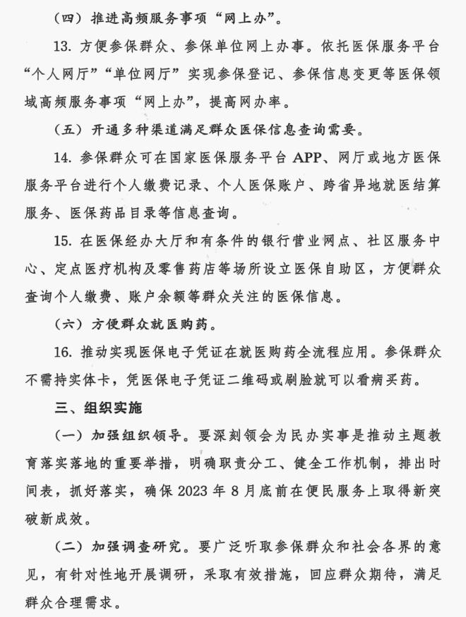 为深入贯彻落实医保系统“我为群众办实事”活动要求,持续提升医保经办服务标准化、规范化、便捷化水平,现将《国家医疗保障局办公室关于实施医保服务十六项便民措施的通知》(医保办发〔2023〕16号)转发你们,并结合我市实际提出如下贯彻落实意见,请一并遵照执行。