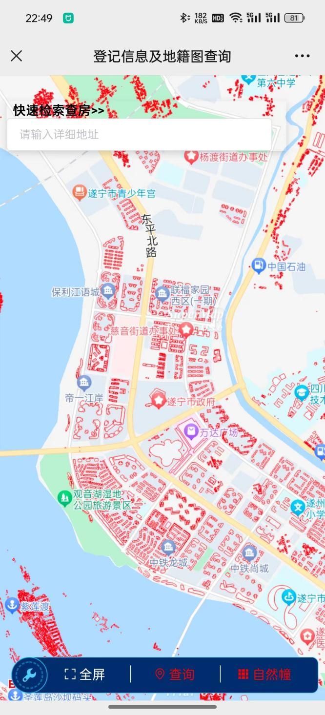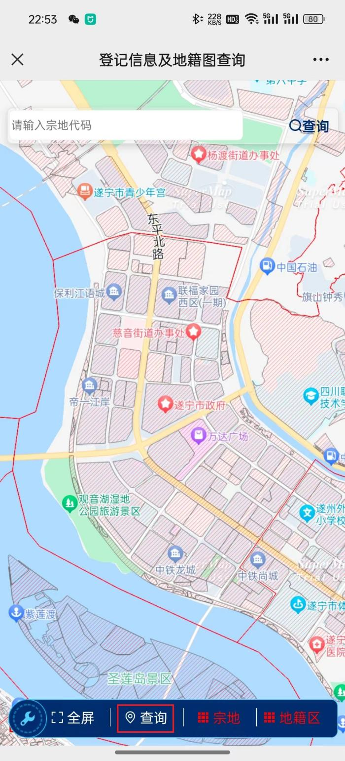 1.点击遂e登微信公众号“地籍图查询”服务,点击“地籍区”“宗地”打开楼栋图层;