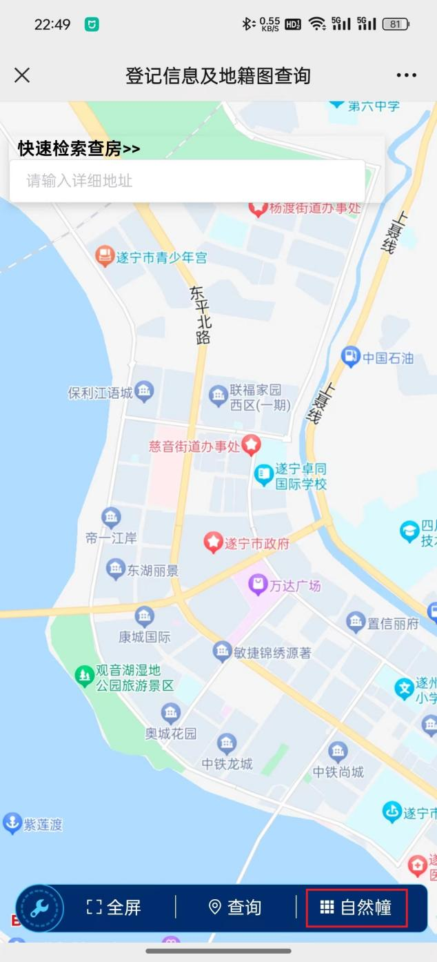 1.点击遂e登微信公众号“以图查房”服务,点击“自然幢”打开楼栋图层;