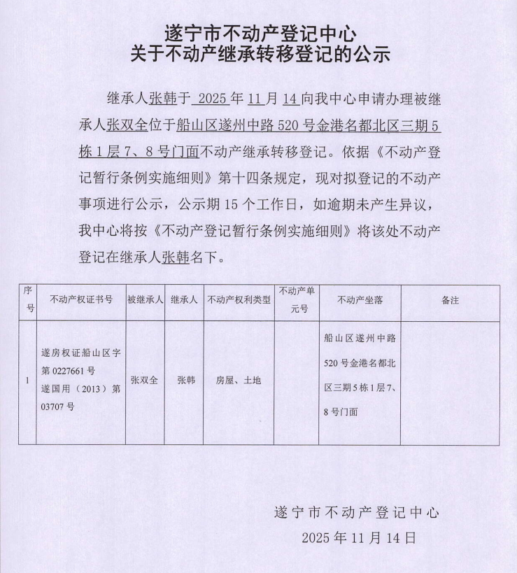 遂宁市不动产登记中心关于不动产继承转移登记的公示(张韩)